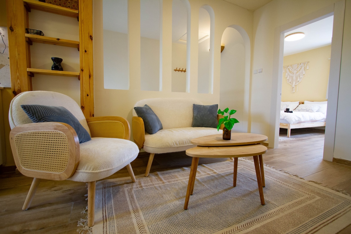 Tu hogar lejos de casa te espera aquí. Acogedor y cómodo para tu visita a Aqaba, en el mar Rojo, con una cama tamaño súper king y un relajante balcón privado con vistas a la montaña y al mar. Hasta pronto. Ubicación: * Aeropuerto de Áqaba: 8 kilómetros * Centro comercial del centro: 10 kilómetros * Playa más cercana (acceso público/resorts de pago): 10 kilómetros * South Beach, sitio de buceo y esnórquel: 17 kilómetros * Mercado, farmacia, panadería, comida para llevar, tienda de comestibles: 300 metros