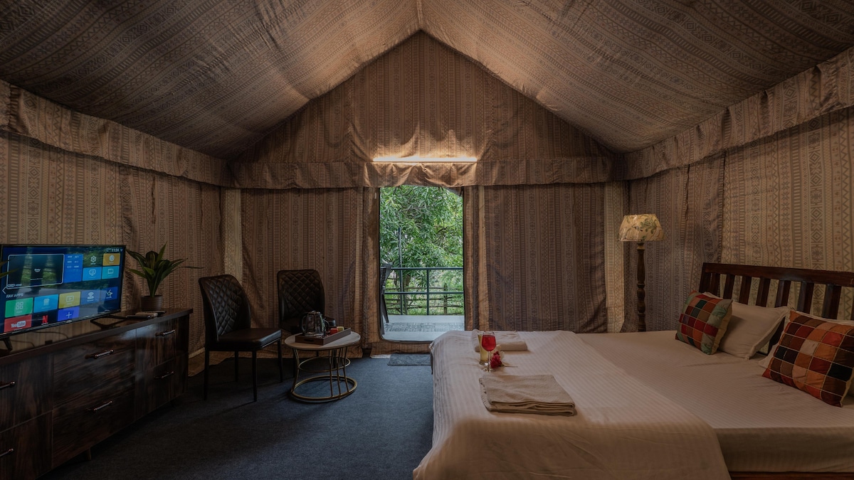 Set on a serene 10-acre green property surrounded by 40-year-old trees, the Family Octagon Tent offers a spacious and cosy stay for families or small groups. Located one hour from Kalyan and 2 km from Vasind Railway Station, it’s an easy nature escape. The tent accommodates 3 adults or 2 adults with 2 children and includes mattresses, shared hot-water washrooms, meals, swimming pool access, kayaking (weather-permitting), nature walks, BBQ, and nearby attractions.