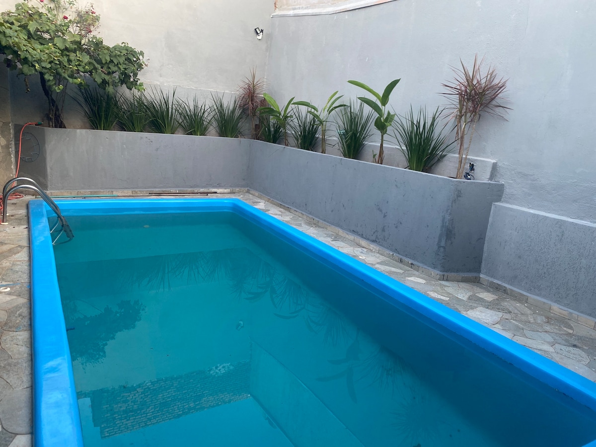Amplio, acogedor: 2 dormitorios (1 suite) con aire acondicionado, baño exterior, sala de estar, cocina completa, área gourmet con parrilla, lavandería y piscina con rejilla de protección. Smart TV, wifi y garaje para 5 coches; para familias en temporada, eventos en la ciudad, fiestas familiares, viajeros de negocios. Precio exclusivo para al menos 2 personas, según el número de invitados. Para recibir huéspedes, ponte en contacto con el anfitrión. Las estancias con más de 7 personas no pagan tarifa de visita. Tarifas especiales y negociables para estancias largas.
