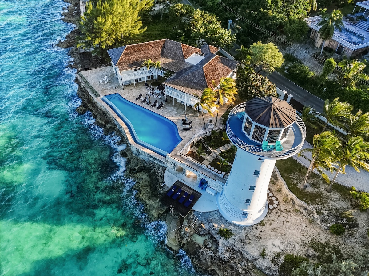 Experience a unique escape in this historic 1950s lighthouse, beautifully renovated across six levels. The glass-enclosed top room offers 360-degree views of the turquoise Bahamian water and stunning sunsets. Enjoy a large infinity pool with an expansive patio, shaded lounges, and a covered BBQ area for outdoor dining. A private oceanside dock below offers easy swim access and loungers for relaxing by the water. You will also enjoy use of the fully equipped main house kitchen.