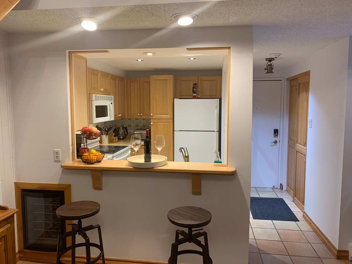 Desconecta de la rutina en este alojamiento único y relajante. Situado directamente en la pendiente. EL MEJOR ACCESO DIRECTO A LAS PISTAS DE ESQUÍ EN TREMBLANT. Este apartamento de un dormitorio con aire acondicionado (cama tamaño queen) y chimenea de madera tiene capacidad para 4 personas y está bien equipado para dar la bienvenida a cualquier amante del aire libre. Para el acceso directo a las pistas de esquí, ten en cuenta que hay unos 50 escalones desde el apartamento hasta la pista de Chalumeau para empezar o volver de tu día de esquí. CITQ #295941