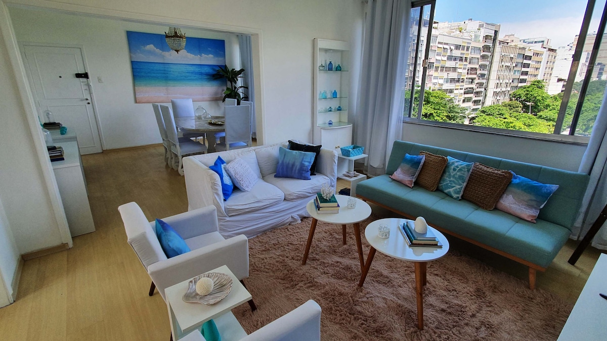 Apartment for 6 people maximum to building regulation, at 3 minutes from Copacabana beach, post 6, with 3 bedrooms, 2 bathrooms, kitchen, air conditioning and central hot water. Partial view of the sea. 4 TV with cable + WIFI and Netflix Apartamento para um máximo de 6 pessoas, de acordo com os regulamentos de construção, a 3 minutos da praia de Copacabana, posto 6, com 3 quartos, 2 banheiros, cozinha, ar condicionado e central de água quente. Sala de estar, sala de jantar e varanda. 4 TV + WIFI