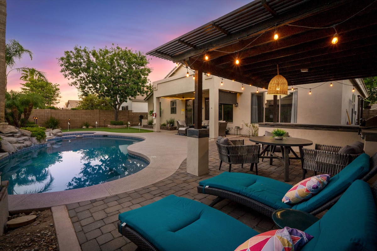 🏊 Year-round relaxation in heated saltwater pool & spa (gentle on skin/eyes) 🔥 Cozy up to fire features 🍳 Fully stocked kitchen + outdoor propane BBQ grill 🎱 Game room with pool table, foosball, darts, & big-screen TV 🌞 Outdoor dining area & bar for enjoying AZ weather 📺 Outdoor TV for games/movies while soaking in the spa 🚗 Easy access to 2 major freeways 🎨 Artfully & uniquely decorated Resort-like escape in Phoenix (Glendale mailing) – perfect for family, golf trips & holidays