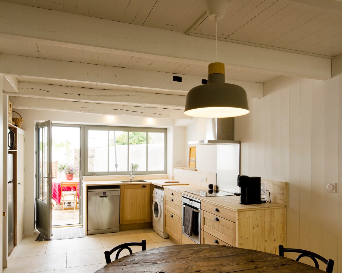 Centro de Ars-en-Ré, pero en una calle lateral tranquila, una casa de nuevo diseño con un ojo para el diseño, con patio, paredes de piedra y cerca de todo. Maison de charme et design au cœur du village d 'Ars-en-Ré, au calme, avec cours, murs de moellons, proche de tout.