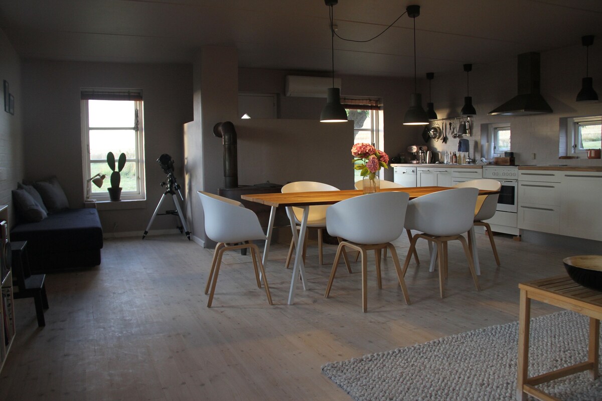 Habitación para toda la familia en un apartamento de 3 dormitorios recientemente renovado en una antigua granja danesa. Despiértate con la vista de los campos ondulantes. La base perfecta para tus vacaciones de senderismo, ciclismo, turismo o playa. Alquilarás la mitad de la casa, con una puerta insonorizada que separa las dos mitades. Es un apartamento totalmente separado con su propia cocina, baño y jardín orientado al este.