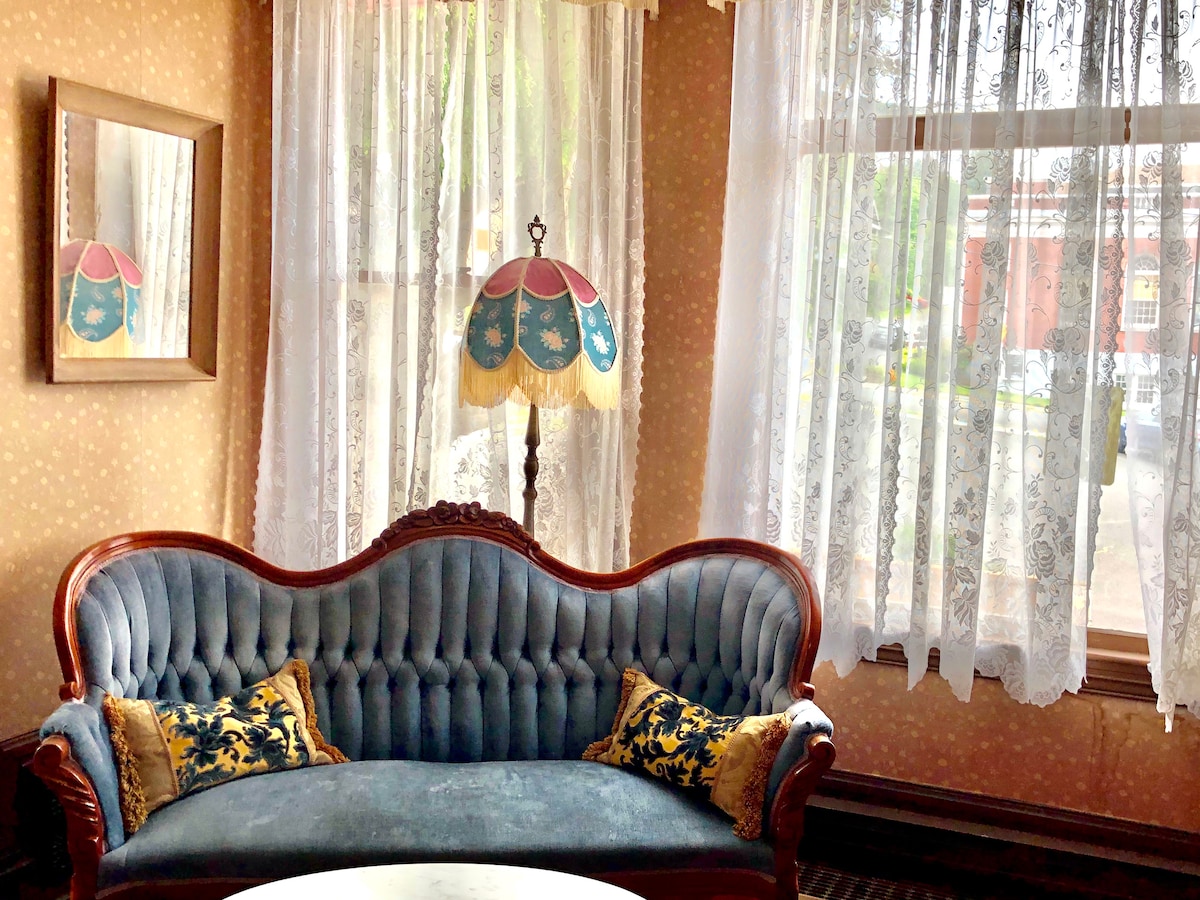 Ubicado en el segundo piso del Ala Histórica. El techo de abeto y la pared originales te llevan de vuelta cuando el alcalde usó esta habitación. Relájate mientras disfrutas de un baño en la antigua bañera con patas en el baño privado (sin ducha separada). Hay un ventilador de techo para tu comodidad. El desayuno es de cortesía. Los huéspedes deben tener más de 21años para poder reservar. El hotel admite mascotas.