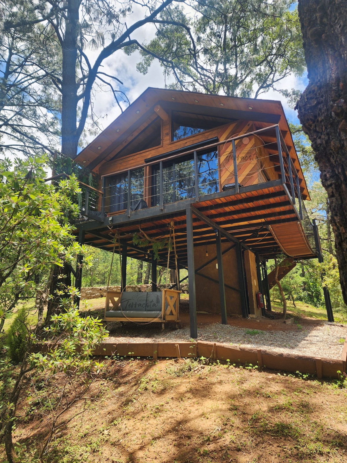 La cabaña es un lugar único de convivencia familiar y confort emocional. Es un solo espacio abierto, donde en la planta baja interactuan: 1cama king size, sala, chimenea, estudio de trabajo, cocina equipada, barra alimentos, terraza, baño con jacuzzi panorámico; ademas de un tapanco en planta alta con dos camas matrimoniales. Debajo de la cabaña al exterior: una mesa de juegos rodeada de naturaleza, con bonita vista, hamacas y asador. Fraccionamiento Pet friendly & WIFI