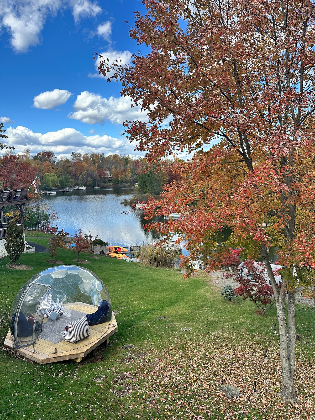 Escapada al lago y vistas otoñales: jacuzzi, cúpula y kayaks