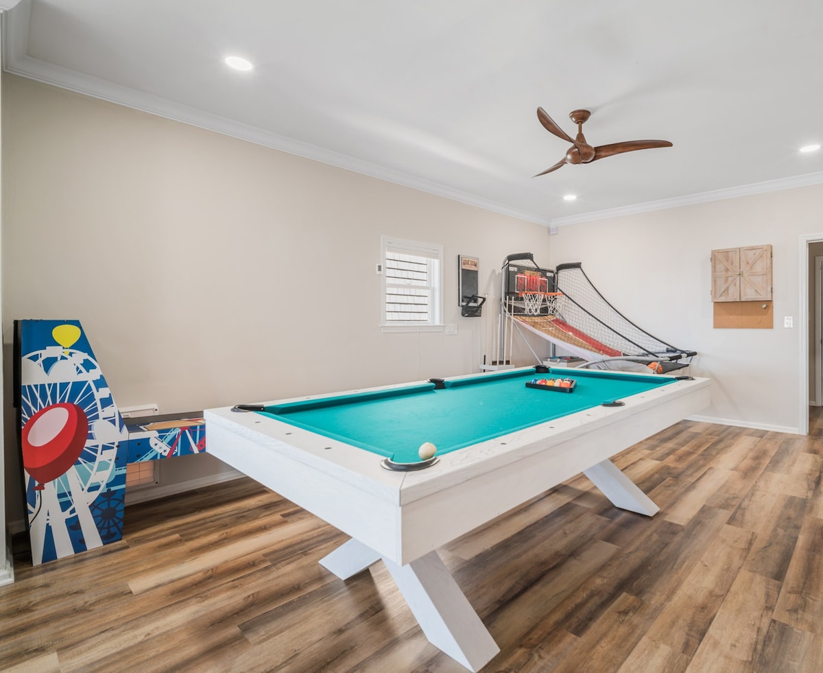 Trae a familiares y amigos a esta encantadora casa con un montón de espacio para crear recuerdos. Cuatro dormitorios tienen capacidad para 10 personas. La habitación extra tiene sofá cama tamaño queen y espacio para relajarse o trabajar. El gran plano de piso abierto con sala de estar, comedor y cocina es un lugar de reunión ideal para la familia. La isla extragrande es un lugar estupendo para preparar comidas. Terraza exterior junto a la cocina. A 5-7 minutos a pie de una playa familiar. Termina el día en tu piscina y patio privados. Estás a solo 8 millas de los casinos de aire acondicionado.