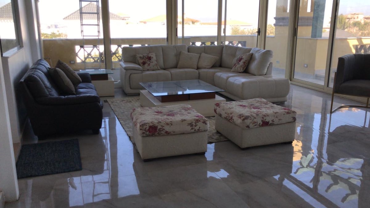 Stay in the luxury stylish 4-bedroom villa in Azha with a double private garden with stunning pool & crystal-lagoon views Enjoy luxury furniture, high-speed WiFi, 2 Smart TVs, premium sound system, and full A/C. The smart kitchen has a microwave, dishwasher, laundry washer, air fryer, stove and oven, and large fridge. With 7 comfy beds this villa is perfect for families seeking a relaxing, upscale escape extra 1500 L.E for person during the whole period of host up to 1 week(for beach access)