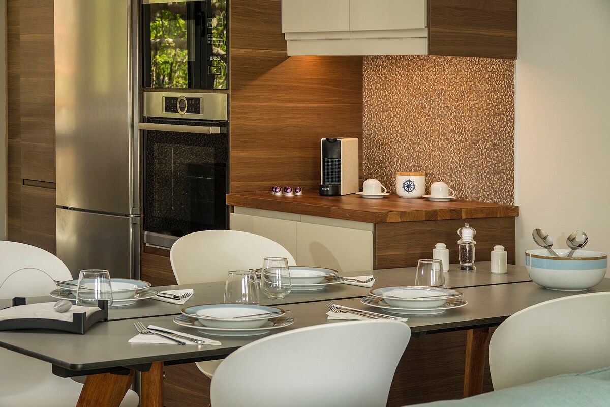 Esta residencia de planta abierta que se expande en dos niveles ofrece una estancia cómoda y elegante. El mármol, junto con la madera de roble y los detalles dorados, crean una atmósfera sencilla y encantadora. La mesa antigua con las sillas únicas junto a la ventana crean el lugar perfecto para admirar la inolvidable vista de la ciudad y la colina de Lycabetous. La cocina totalmente equipada con nevera y horno, estufas eléctricas y cafetera Nespresso hará que te sientas como en casa.