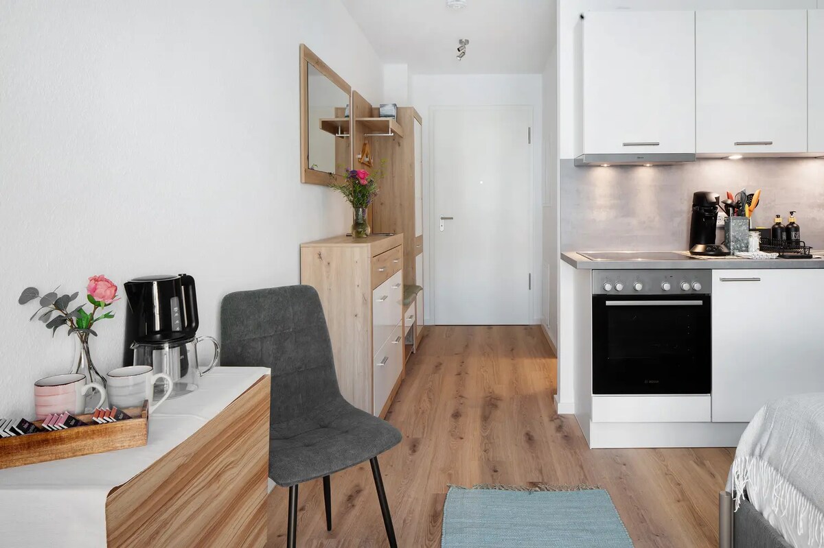 Nuevo apartamento con estilo y una gran cama doble (180 x 200 cm), decorado con un papel pintado con fotos de mandalas en 3D, que invita a disfrutar de una combinación perfecta de escapada urbana y la Selva Negra. Café y té incluidos. A un minuto de distancia se sirven deliciosos desayunos en el Kaiser Loft. El conocido distrito ecológico de Friburgo Vauban está a 2 minutos a pie. La estación central de Friburgo se encuentra a 10 minutos en coche y a 15 minutos en transporte público.