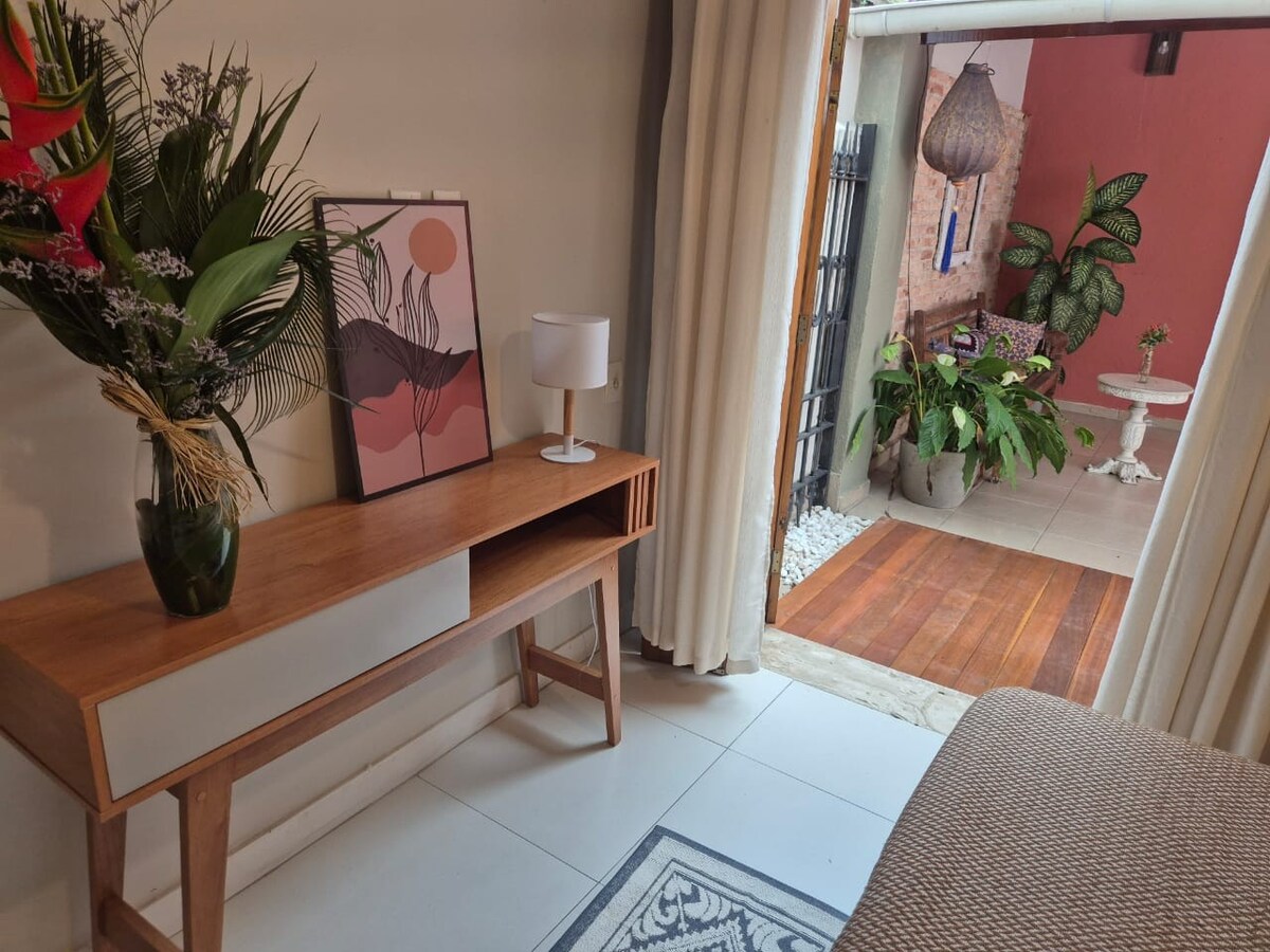 La libertad, la naturaleza y la simplicidad definen esta casa en Guarujá, ideal para aquellos que buscan tranquilidad. Ubicado en la playa más familiar de la región, ofrece un entorno acogedor con el sonido de las aves, las frutas en el patio trasero y la vida con Jabuti Juju, en la familia durante 20 años. Un Neide casero, siempre atento, garantiza la seguridad y la hospitalidad. La casa tiene utensilios, TV inteligente, internet, habitaciones cómodas y ventiladores de techo. En constante mejora, manteniendo la esencia simple.