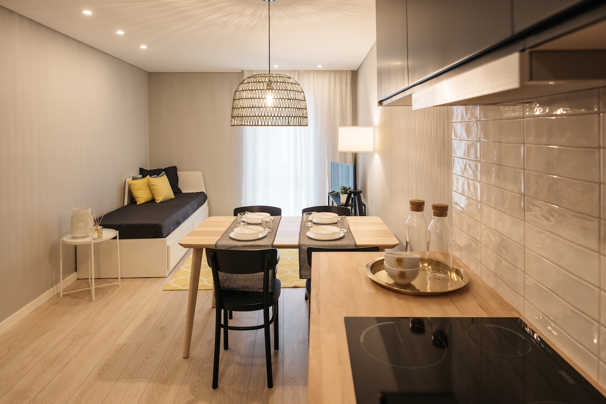 Apartamento T1 moderno y acogedor en el corazón de Aveiro – Beira-Mar. Ubicación excelente, cerca de los canales y de la zona de restaurantes — ideal para explorar la ciudad a pie. Espacio moderno y funcional, pensado para el bienestar. Dormitorio con cómoda cama king size (180 cm) y cocina totalmente equipada con lavavajillas y utensilios. Salón confortable con Wi-Fi, aire acondicionado y Smart TV. Baño con amenities de la marca Rituals.