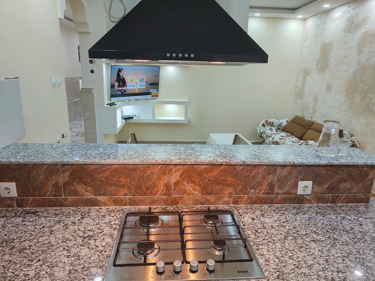 -APPARTEMENT au rez-de-chaussée surélevé au quartier "camp chevalier" a Jijel -8 COUCHAGES, 1 lit double, 2 lits simples, les 2 "lits" au salon peuvent être changé le soir pour pouvoir dormir dessus, +2 matelas en plus si besoin -PARKING en face -WIFI INTERNET -ÉLECTRONIQUE micro onde, four, plaque cuisson, grille pain, bouilloire, machine à café , machine à laver, sèche cheveux 2 clims ... -LA PLAGE a 5 - 10 minutes en voiture -Proche de la ville et de toute commodité