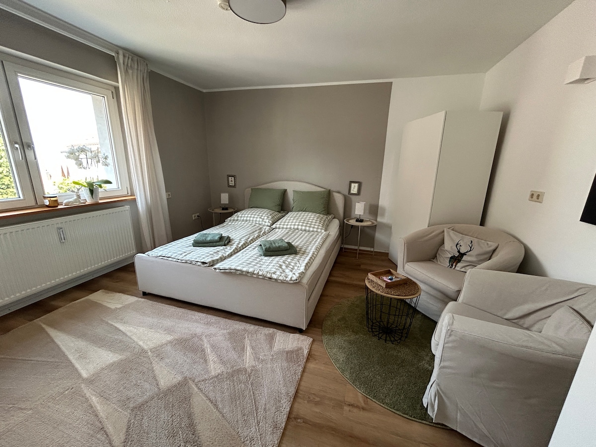 ¡Todos nos damos una cálida bienvenida a nosotros mismos en el Palatinado! Nuestra casa está ubicada en el "Kirchengässl" en la ruta del vino justo al lado de la Jakobuskirche. Se puede llegar a las dos habitaciones a través de nuestra escalera privada en el 2do piso (ático). El piso tiene 2 dormitorios, 1 privado. Baño, 1 antesala y 1 sala de recreación. Damos la bienvenida a nuestros huéspedes, si lo deseas, por la mañana con un desayuno vegetariano. Nota: Hay una tarifa de limpieza de 15 EUR por persona, que se paga en efectivo en el sitio.