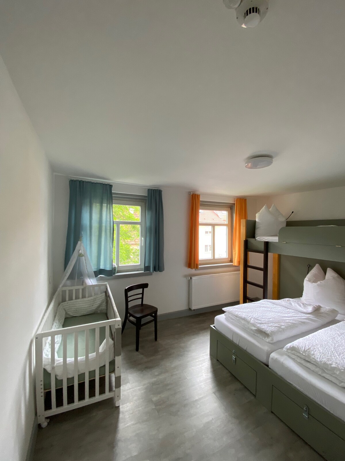 Alte Fabrik, refurbed. Die Fabrik wurde zu Gästezimmern im Hostelstil für aktive Urlauber umgebaut - keine Monteurzimmer. Ankommen, Relaxen, Wohlfühlen und aktiv Urlaub machen. Gästezimmer 3 enthält ein Doppelbett (140x200cm) und ein Etagenbett (2*90x200cm). Vor dem Gästeraum 3 liegt das Gästezimmer 2. Beide Räume bieten in Kombination bis zu 8 Schlafplätze. Ihr müsstet Gästezimmer 2 zu diesem Raum durchlaufen.