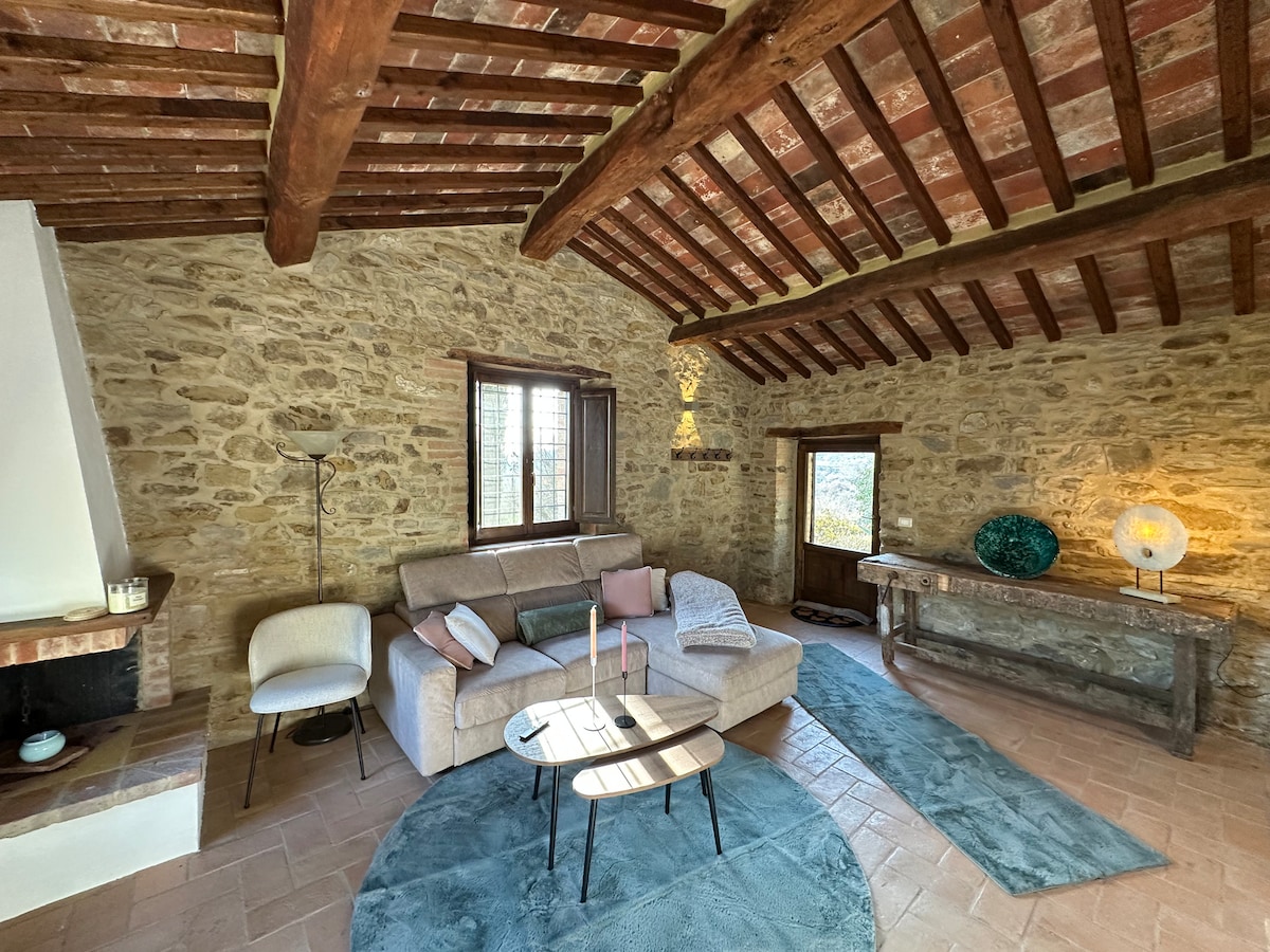 La casa rural fue construida con antigua piedra procedente localmente en Umbría y ofrece una vista impresionante con vistas al valle circundante. La casa abarca una amplia sala de estar con dos chimeneas antiguas, dos cocinas, una sala de recreación, cinco dormitorios y cuatro baños. En el exterior hay una gran piscina, comedor, una casa de juegos para niños, múltiples opciones de aparcamiento y un garaje totalmente cerrado para 2 autos. También hay una barbacoa y un horno de leña si deseas cocinar afuera.