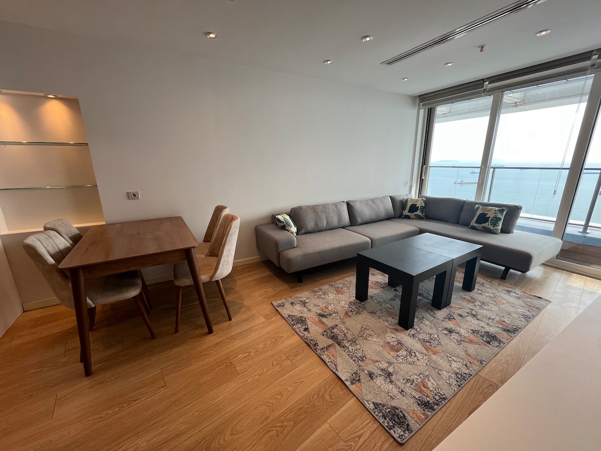Acerca de este espacio Este lugar único tiene su propio estilo. La propiedad está justo al lado del mar y tiene una hermosa vista única al mar. Puedes disfrutar del atardecer desde el dormitorio y la sala de estar. La propiedad está en el piso 20 y está en la sección central del edificio, con una vista muy amplia y panorámica del mar. Se encuentra a 5 minutos a pie de la línea de metro Marmaray. Hay una parada de taxis. Está a 5 minutos a pie del Fisekhane ( farmacia , mercado, restaurante, etc.).