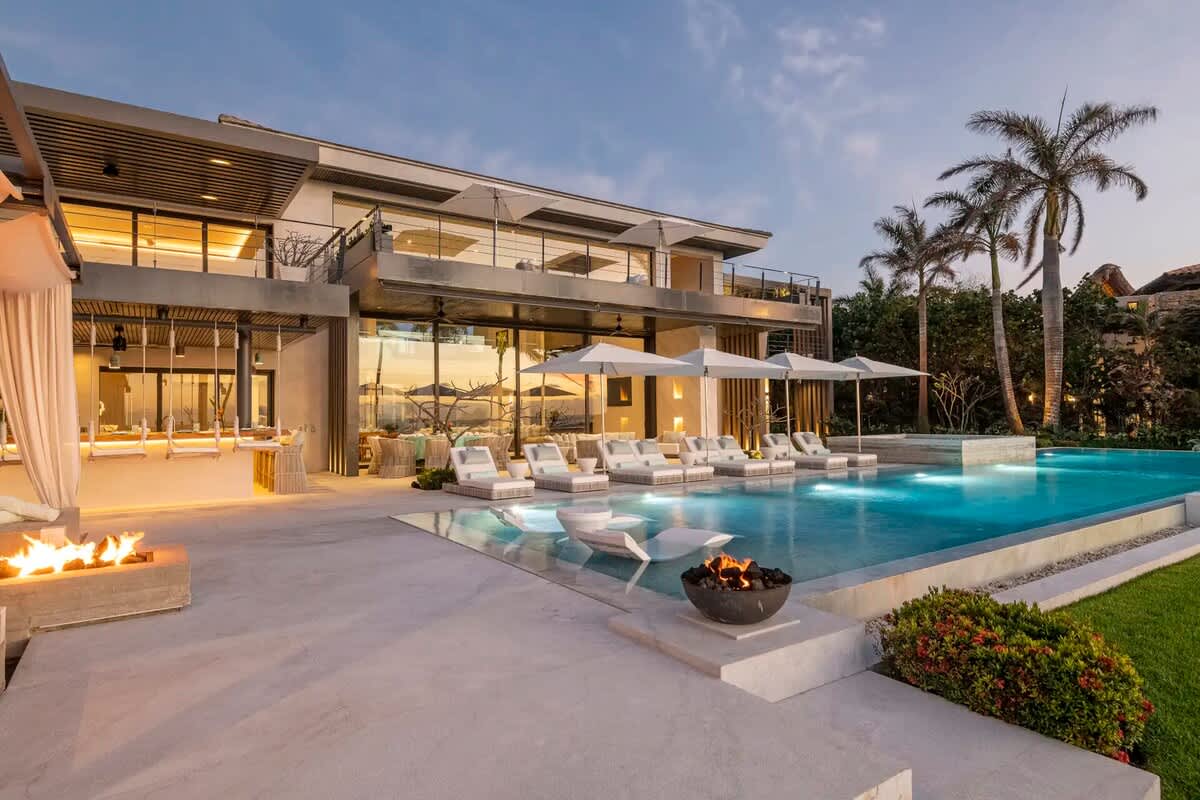 Like the waves spill onto the shore, layers of texture and color spill over each other at this waterfront Punta Mita mansion. The fully staffed estate boasts the amenities of a boutique hotel—think beachfront bar and private spa—all housed within gorgeously appointed rooms with details like parquet ceilings. Guests are welcome at 4 beach clubs, and it’s a 7-minute drive to the Litibú Golf Course. Host groups of friends, a family reunion or even a Mexico destination wedding in the villa’s outdoor living areas with the help of the lounging and dining areas, full-service bar, barbecue, and hot tub. There’s one infinity pool for swimming and a separate pool for volleyball, as well as a bocce court, surfboards and paddleboards, and bicycles to borrow. Inside, you’ll find a games room, bowling alley, and golf simulator for fun, plus a yoga area, spa, and home gym for wellness. Beyond the amenities, it’s the style of this vacation rental that truly gives it luxury appeal. Texture on texture—tufted area rug on polished stone floor, gauzy drapes over floor-to-ceiling windows—gives a chic, layered look in the living and dining rooms. It even continues in the fully equipped kitchen, where a vaulted brick ceiling arches over stone and wood counters and cabinets. The villa has 6 bedrooms with king beds, including 2 honeymoon-worthy ocean-view primary suites, 2 bedrooms with 2 queen beds each, and 2 bedrooms with 2 twin-over-queen bunk beds each. All 10 bedrooms have ensuite bathrooms, Apple TVs, and air conditioning. Take the 2 provided 6-passenger golf carts to one of 4 nearby beach clubs, where you can introduce the kids to snorkeling in the calm waters off Kupuri Beach Club or have a drink at the Sufi Ocean Club, then pop over to Punta Mita Pier. While the villa gives you a holiday right on the beach, it’s also a 5-minute drive to the jungle-lined trail to the unspoiled white sand and surf break at Playa La Lancha. Copyright © Luxury Retreats. All rights reserved. BEDROOM & BATHROOM • Bedroom 1- Primary: King size bed, Ensuite bathroom with stand-alone shower and bathtub, Dual vanity, Walk-in closet, Safe, Ceiling fan, TV room, Apple TV, Lounge area, Air conditioning, Private balcony with outdoor furniture, Direct access to outdoor area, Ocean view • Bedroom 2- Primary: King size bed, Ensuite bathroom with stand-alone shower and bathtub, Bidet, Dual vanity, Walk-in closet, Safe, Ceiling fan, Television, Apple TV, Lounge area, Office, Air conditioning, Private terrace with outdoor furniture, Direct access to outdoor area, Ocean view • Bedroom 3: King size bed, Ensuite bathroom with stand-alone shower and bathtub, Bidet, Dual vanity, Walk-in closet, Safe, Ceiling fan, Television, Apple TV, Lounge area, Air conditioning, Private terrace with outdoor furniture, Ocean view • Bedroom 4: King size bed, Ensuite bathroom with stand-alone shower and bathtub, Dual vanity, Walk-in closet, Safe, Ceiling fan, Television, Apple TV, Air conditioning, Private terrace with outdoor furniture, Ocean view • Bedroom 5: King size bed, Ensuite bathroom with stand-alone shower, Dual vanity, Safe, Ceiling fan, Television, Apple TV, Air conditioning, Private balcony with outdoor furniture, Ocean view • Bedroom 6: King size bed, Ensuite bathroom with stand-alone shower, Dual vanity, Safe, Ceiling fan, Television, Apple TV, Air conditioning, Private balcony with outdoor furniture, Ocean view • Bedroom 7: 2 Queen size beds, Ensuite bathroom with stand-alone shower, Dual vanity, Walk-in closet, Safe, Ceiling fan, Television, Apple TV, Air conditioning, Private terrace with outdoor furniture, Garden view • Bedroom 8: 2 Queen size beds, Ensuite bathroom with stand-alone shower, Dual vanity, Walk-in closet, Safe, Ceiling fan, Television, Apple TV, Air conditioning, Private terrace with outdoor furniture, Garden view • Bedroom 9: 2 Twin over queen bunk beds, Ensuite bathroom with stand-alone shower, Dual vanity, Walk-in closet, Safe, Television, Apple TV, Air conditioning, Private balcony with outdoor furniture • Bedroom 10: 2 Twin over queen bunk beds, Ensuite bathroom with stand-alone shower, Dual vanity, Walk-in closet, Safe, Television, Apple TV, Air conditioning, Private balcony with outdoor furniture FEATURES & AMENITIES • Cards table • Bowling alley with 2 professional lanes • Golf simulator • Meditation/Yoga room • Two manicure and pedicure stations • Hair wash and blow out area • More under “What this place offers” below OUTDOOR FEATURES • Volleyball pool • Bicycles • High end golf clubs • Surf and paddle boards SHARED ACCESS TO PUNTA MITA RESORT AMENITIES (advance notice required, subject to availability, fees may apply) Included: • Access to St. Regis Sea Breeze Beach Club • Access to Kupuri Beach Club • Access to Sufi Ocean Club • Access to Pacifico Beach Club • Access to Bahia and Pacifico Golf Course with preferred tee-times • Access to Club Punta Mita Fitness center • Access to Club Punta Mita tennis courts • Access to Four Seasons, St Regis, and Punta Mita Beach Club Spas • Ocean access via Punta Mita's pier STAFF & SERVICES Included: • 2 concierges • 3 maintenance staff • Estate manager Extra cost (advance notice may be required): • Babysitter service • Activities and excursions • More under “Add-on services” below