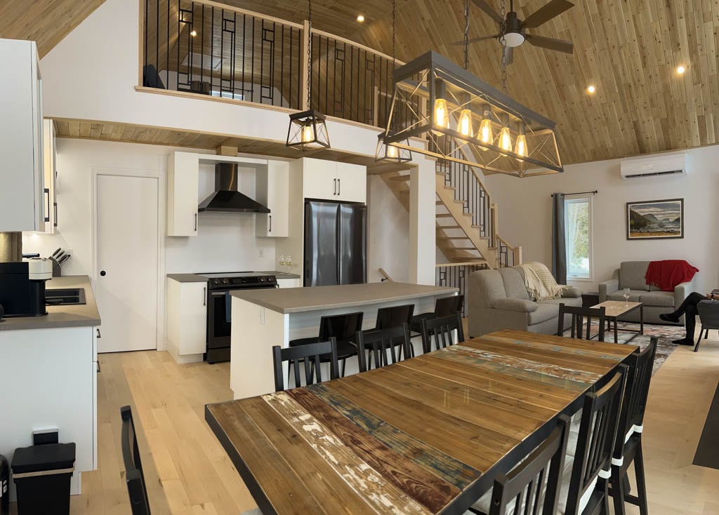 Kick back and relax in this calm, stylish space. This charming chalet is the perfect mountain getaway for your next vacation. Nestled in a picturesque mountain and lake landscape, the chalet offers a breathtaking view of the Mont-Comi and its beautiful surroundings – only 30 minutes from Rimouski. The interior is warm and inviting, with a cozy fireplace in the living room, and comfortable furnishings throughout.