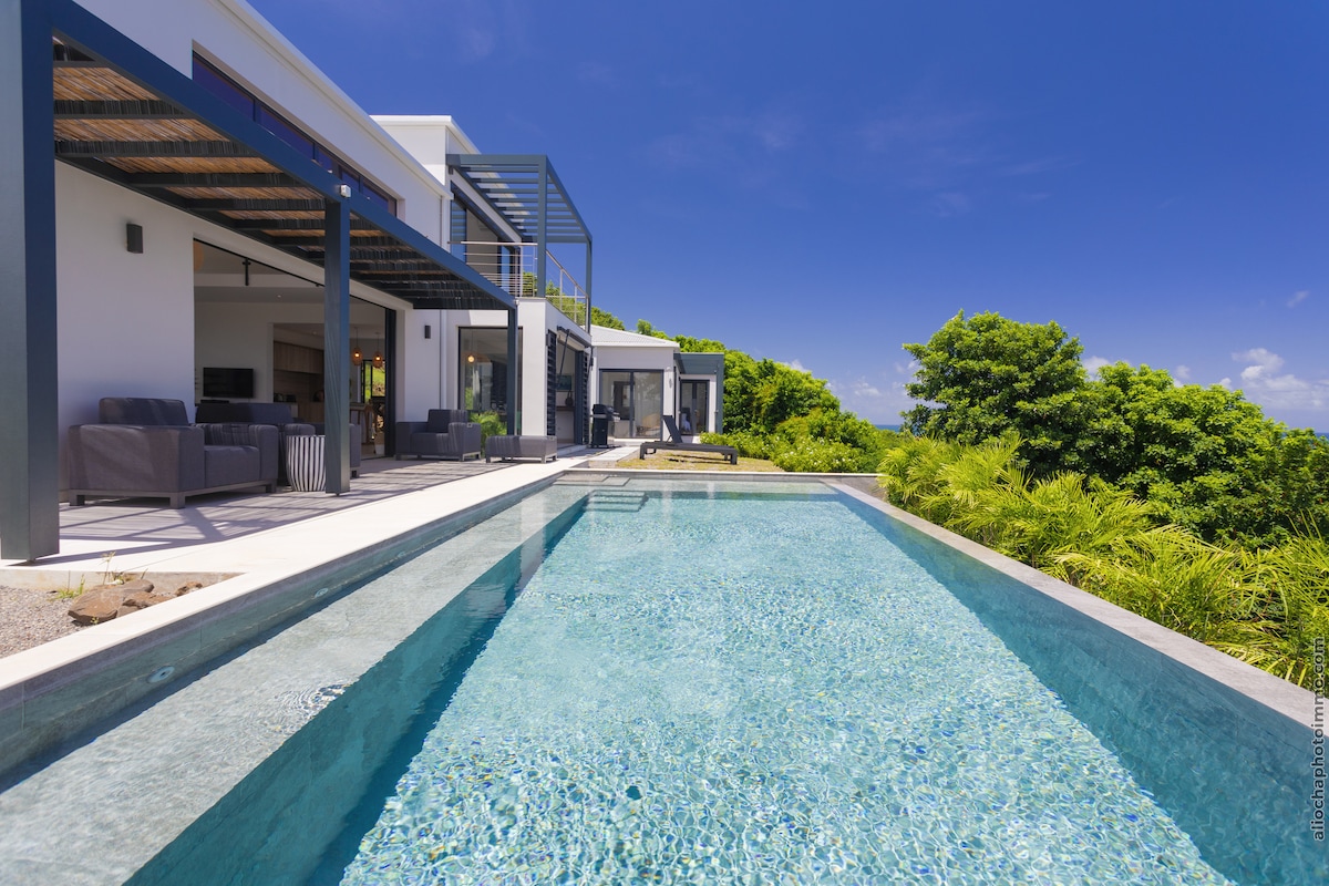 La villa Amara 2 se niche dans le Domaine d'Amara, un lieu privé et sécurisé où la vue sur la mer des Caraïbes est à couper le souffle. La villa construite en 2025 est tres spacieuse (500m2) incluant une très grande terrasse de 200m2 avec une piscine à débordement de 11m x 4m d'où l'on peut voir chaque soir le coucher de soleil sur la mer ! La villa est meublée de façon moderne et fonctionnelle, très bien décorée avec ses 4 grandes chambres, chacune avec salle de bain privée.