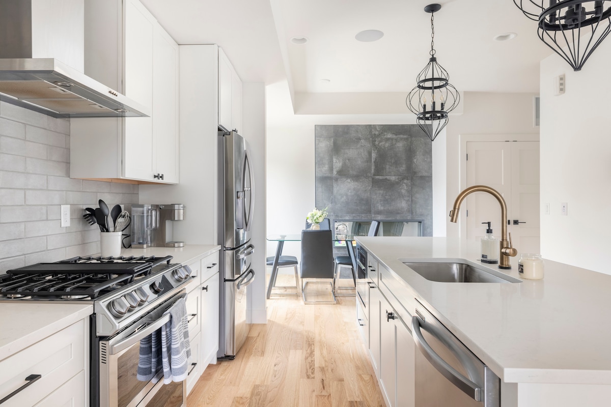 Disfruta de la comodidad en esta elegante casa adosada de 2 dormitorios y 2,5 baños en esquina. Disfruta de tu patio privado en la azotea con vistas impresionantes al horizonte de Denver y a las majestuosas Montañas Rocosas, perfectas para reuniones al atardecer o café por la mañana. Ideal para familias y grupos pequeños, tu hogar lejos de casa cuenta con un espacio de trabajo dedicado, una cocina totalmente equipada y artículos básicos para bebés. Pasea hasta Empower Field o toma un corto trayecto en auto para experimentar cualquiera de las muchas atracciones del centro de Denver.