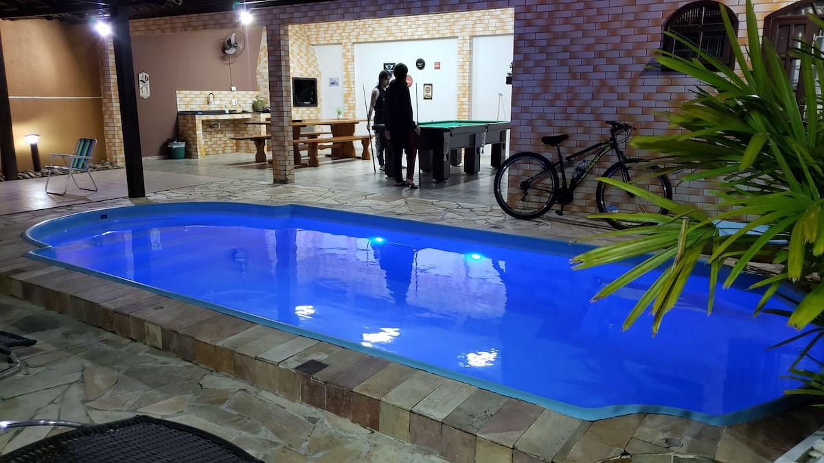 Casa nueva, moderna, cómoda, + o - a 100 metros de la playa. Cuenta con 2 habitaciones demi suites y 3 suites, con capacidad para hasta 14 personas en camas, wifi, aire acondicionado en todas las habitaciones, televisores en todas las habitaciones y en la sala de estar, calefacción central de agua, cocina totalmente equipada, hermosa zona gourmet con cervecería. Vaga para 4 vehículos pequeños o 2 vehículos grandes sistema de cámaras y alarmas con monitoreo las 24 horas.