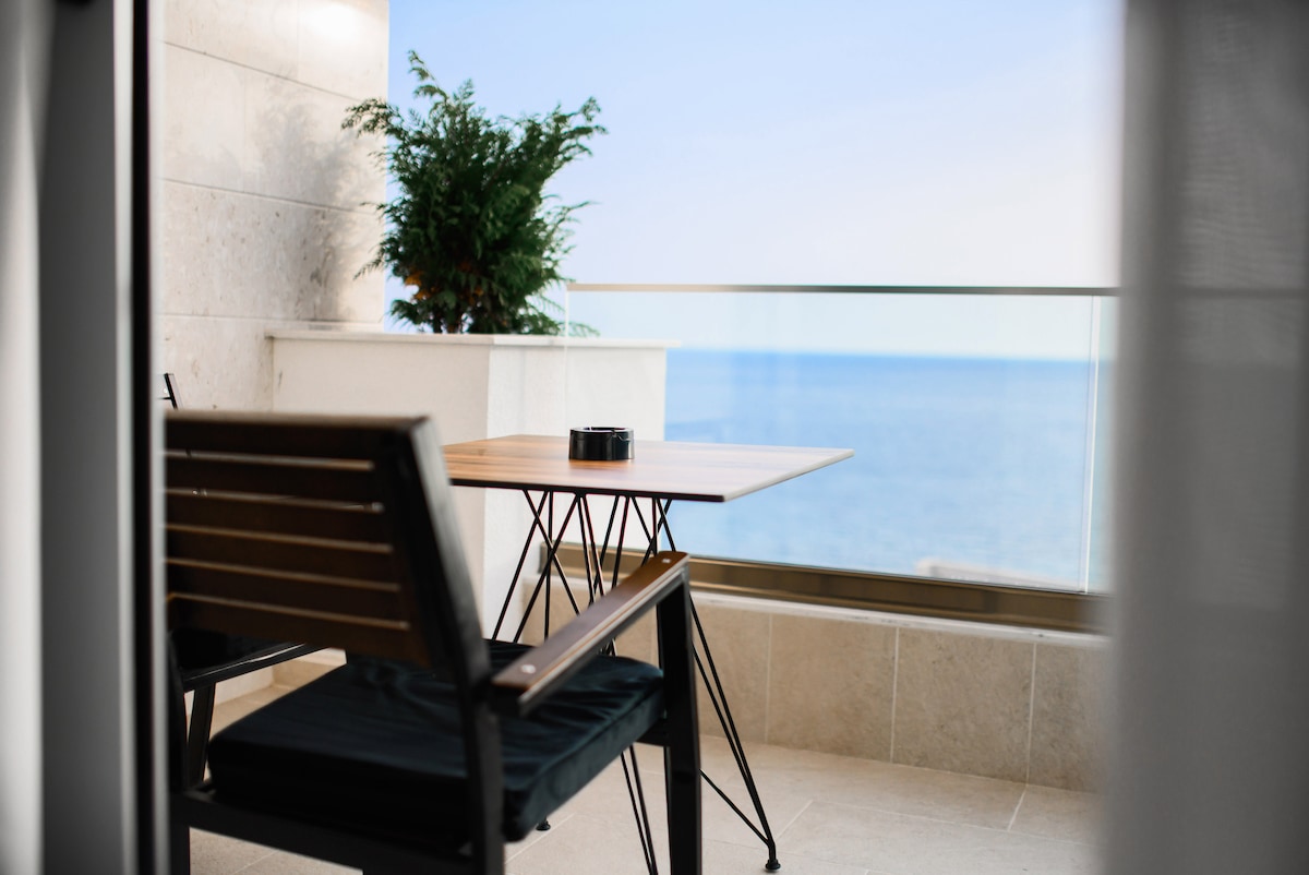 This exquisite two-level apartment boasts stunning sea views and a spacious design. The lower level features BR, fully equipped kitchen, a dining area with seating for 8, and a cozy living room with a sofa and TV. Upstairs are two more serene bedrooms and huge bathroom. A generous balcony with a small table and a terrace with a dining table for 8 offer perfect spots to enjoy the scenery. The stylish interior is finished with natural stone, parquet, and ceramic, blending elegance with comfort.