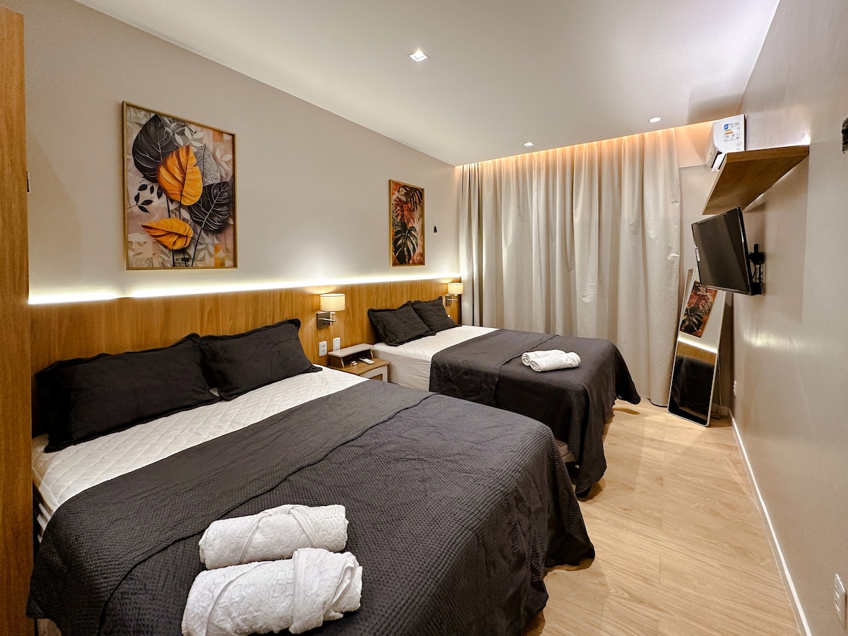Excelente apartamento doble con cama tamaño queen y posibilidad de hasta 4 personas con el sofá cama ubicado en la sala de estar. Dos baños completos con ducha eléctrica y aire acondicionado en todos los entornos. Garaje para un vehículo. Cocina con refrigerador dúplex, cocina a gas con horno y filtro de agua doble. Televisión inteligente de última generación 4K en la sala de estar y el dormitorio. Interior de fibra óptica de alta velocidad, espacio de oficina en casa en el piso superior (para mayor comodidad y productividad). Ropa de lava y seca