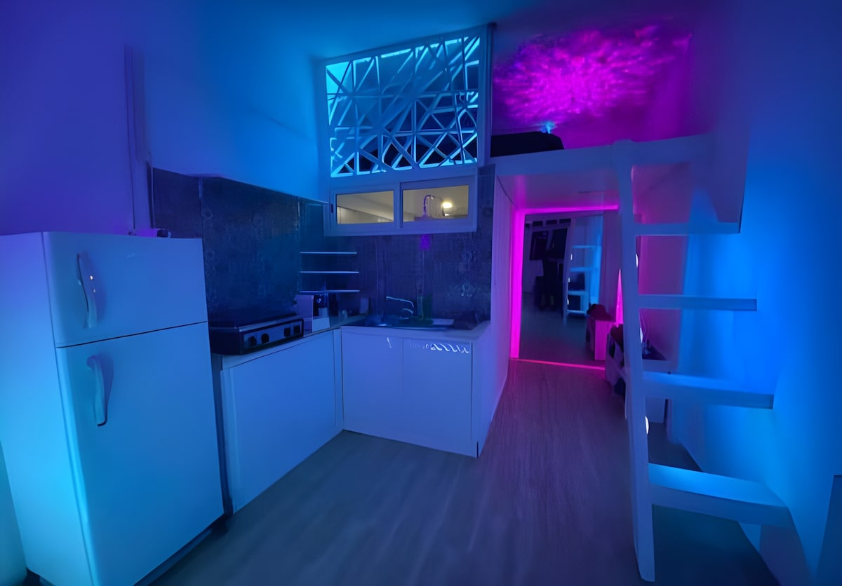 Al entrar, inmediatamente serás recibido por un ambiente cálido. El espacio fue cuidadosamente diseñado para proporcionar un ambiente acogedor e íntimo, perfecto para parejas o personas que viajan solas. La cocina bien equipada te permite preparar comidas ligeras y aperitivos, y cuenta con una mininevera, microondas y cafetera. Comparte una cena romántica o disfruta de un desayuno tranquilo. El amplio espacio al aire libre ofrece vistas panorámicas del horizonte de la ciudad, creando un telón de fondo impresionante para tu estancia.