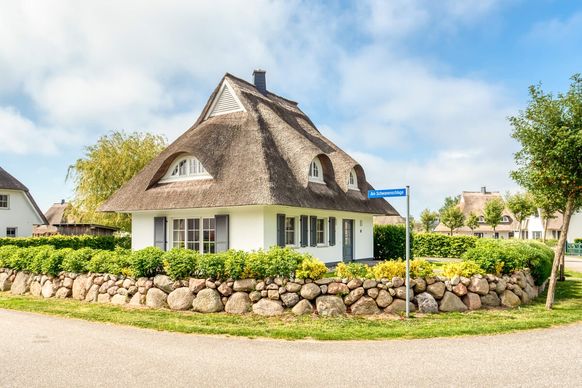 Bienvenido a la elegante casa con techo de paja en una zona tranquila, a solo 100 m del Bodden y cerca del mar Báltico, perfecta para familias, parejas y amigos. 3 dormitorios con camas dobles, 2 cuartos de baño con ducha (1 con bañera), chimenea, sauna, Sky TV y cocina totalmente equipada. Gran terraza suroeste junto al estanque. Punto de partida ideal para recorridos en bicicleta y experiencias en la naturaleza. Los perros son bienvenidos. Toallas, ropa de cama y aparcamiento incluidos.