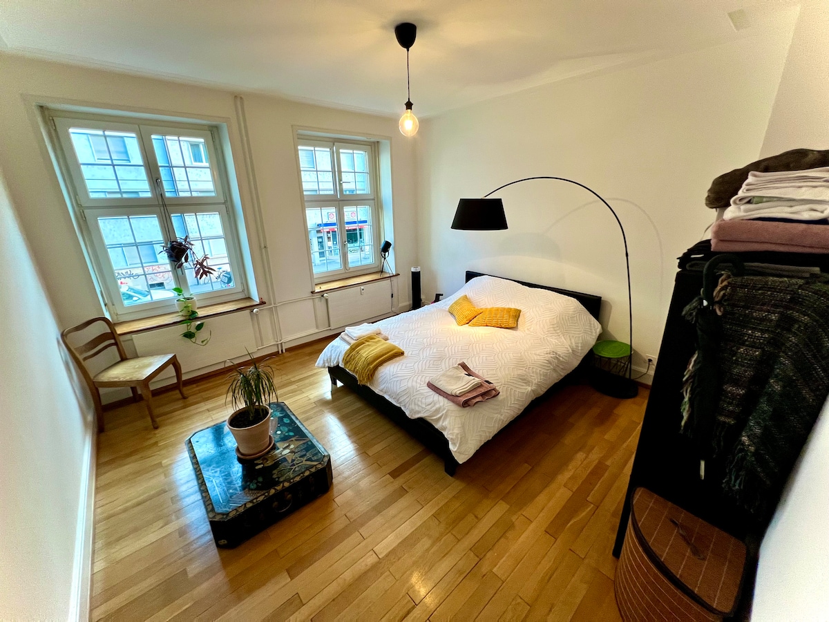 Disfruta de tu estancia en la ciudad de Basilea en un acogedor apartamento minimalista, súper céntrico, a 3 minutos a pie de la Messe y a 10 minutos a pie del centro de la ciudad. Ideal para una pareja con 1 o 2 niños o un amigo. O para cuatro amigos si no les importa compartir el dormitorio (ver foto con cama individual adicional en el suelo). Cocina separada con mesa de comedor y un lindo balcón. La sala cuenta con TV con Netflix, Apple TV, Xbox, etc. ¡Acceso directo al transporte público!