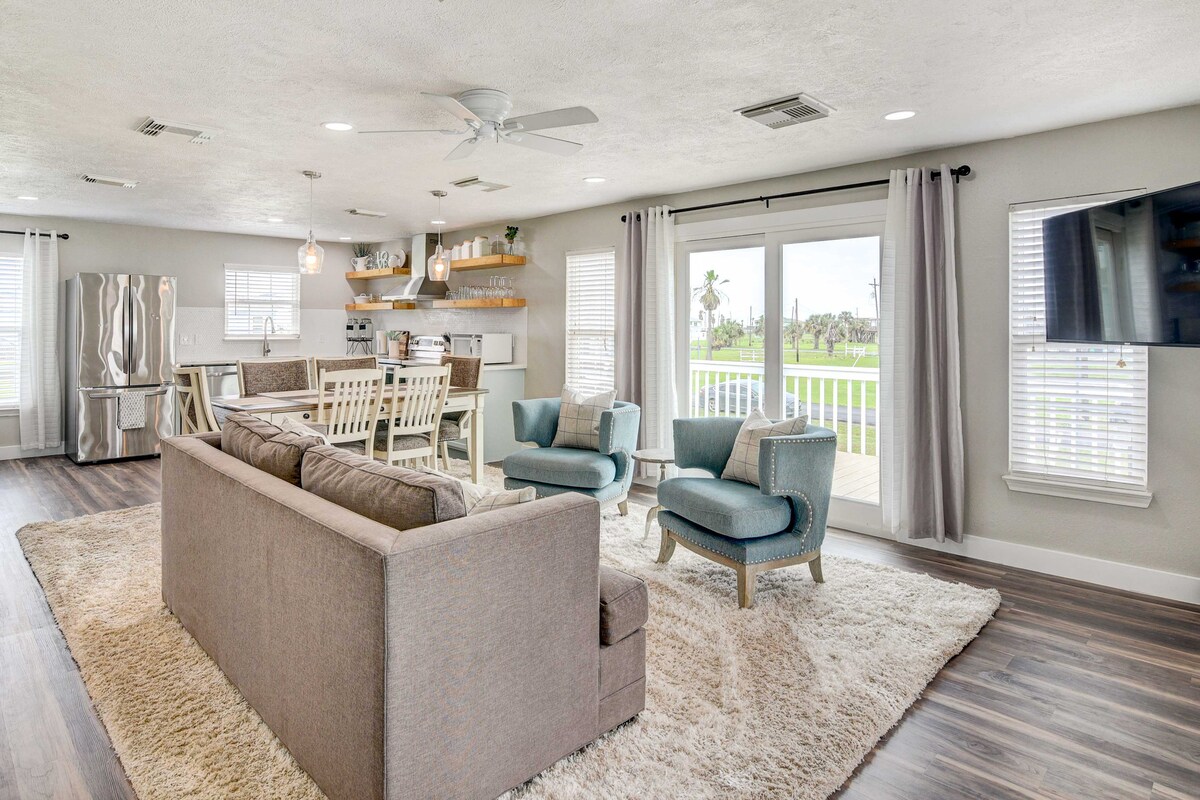4 dormitorios, 2,5 baños, capacidad para 8 personas en 3 camas tamaño king y 1 cama tamaño queen, no se admiten mascotas. Meticulosamente mantenida y equipada con muebles y decoración de lujo, Beachfront Bliss es una casa de 4 dormitorios y 2,5 baños en Galveston que apareció en HGTV. Desde el momento en que te despiertas por la mañana, puedes disfrutar de las vistas a la playa. Cuando estés listo para salir y disfrutar de la arena y el surf, sigue tu pasarela privada hasta la orilla. Te encantará el plano abierto con lujosos muebles de cuero en la sala de estar y los chefs de casa