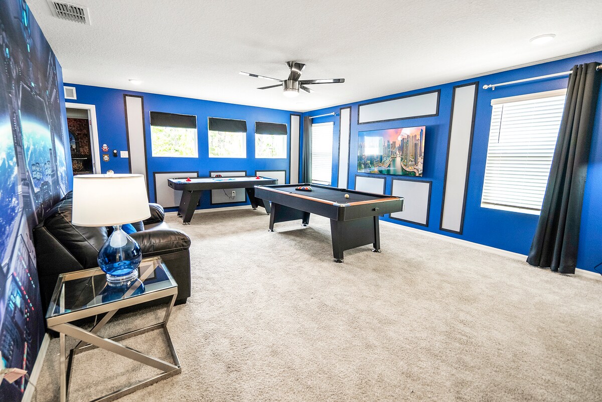 Esta alegre y lujosa casa de vacaciones (construida en junio de 2022) con vistas al lago se encuentra en la sección más nueva del famoso Storey Lake Resort, cerca de Disney World y de los principales parques temáticos de Orlando. Cuenta con una sala de juegos inmersiva de Avatar (air hockey, futbolín, mesa de billar, etc.), 3 áreas de entretenimiento, 9 dormitorios con decoración de alta gama, 5 baños, 12 televisores inteligentes, Netflix, wifi rápido, piscina privada/spa/patio frente a un hermoso lago, toma de corriente eléctrica y acceso completo a los increíbles servicios de la casa club Storey Lake.