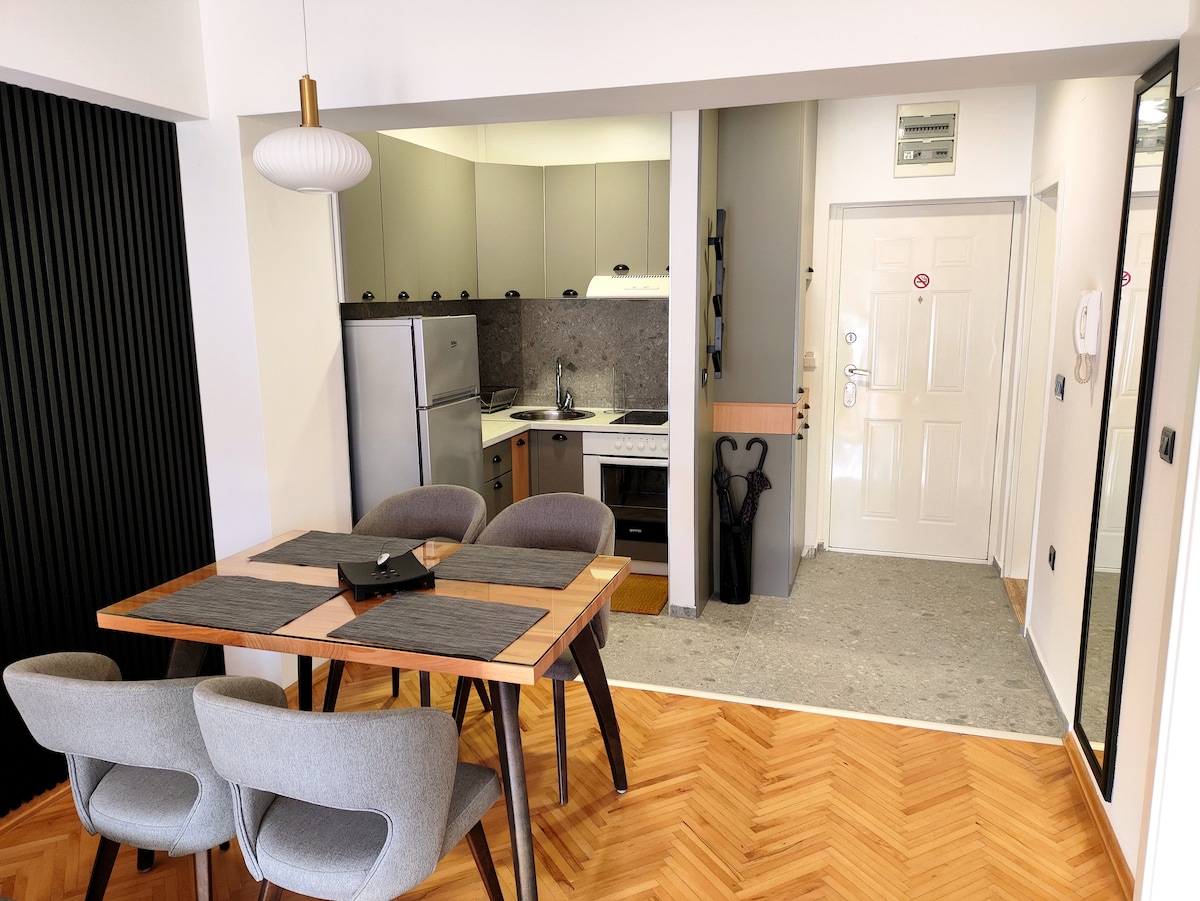 Ubicación perfecta. Diseño moderno. Nuevo apartamento. Estacionamiento GRATUITO incluido en el precio. Este es un nuevo apartamento acogedor donde puedes disfrutar de tus vacaciones. Ubicado en el corazón de Ohrid, a nuestro alrededor está básicamente todo lo que describimos en nuestra sección "vecindario". El lago Ohrid está a unos 100 metros y la playa de la ciudad más cercana está a 10 minutos a pie. La estación central de autobuses está situada a 10 minutos en auto y el Aeropuerto Internacional de Ohrid está a 15 minutos en auto.