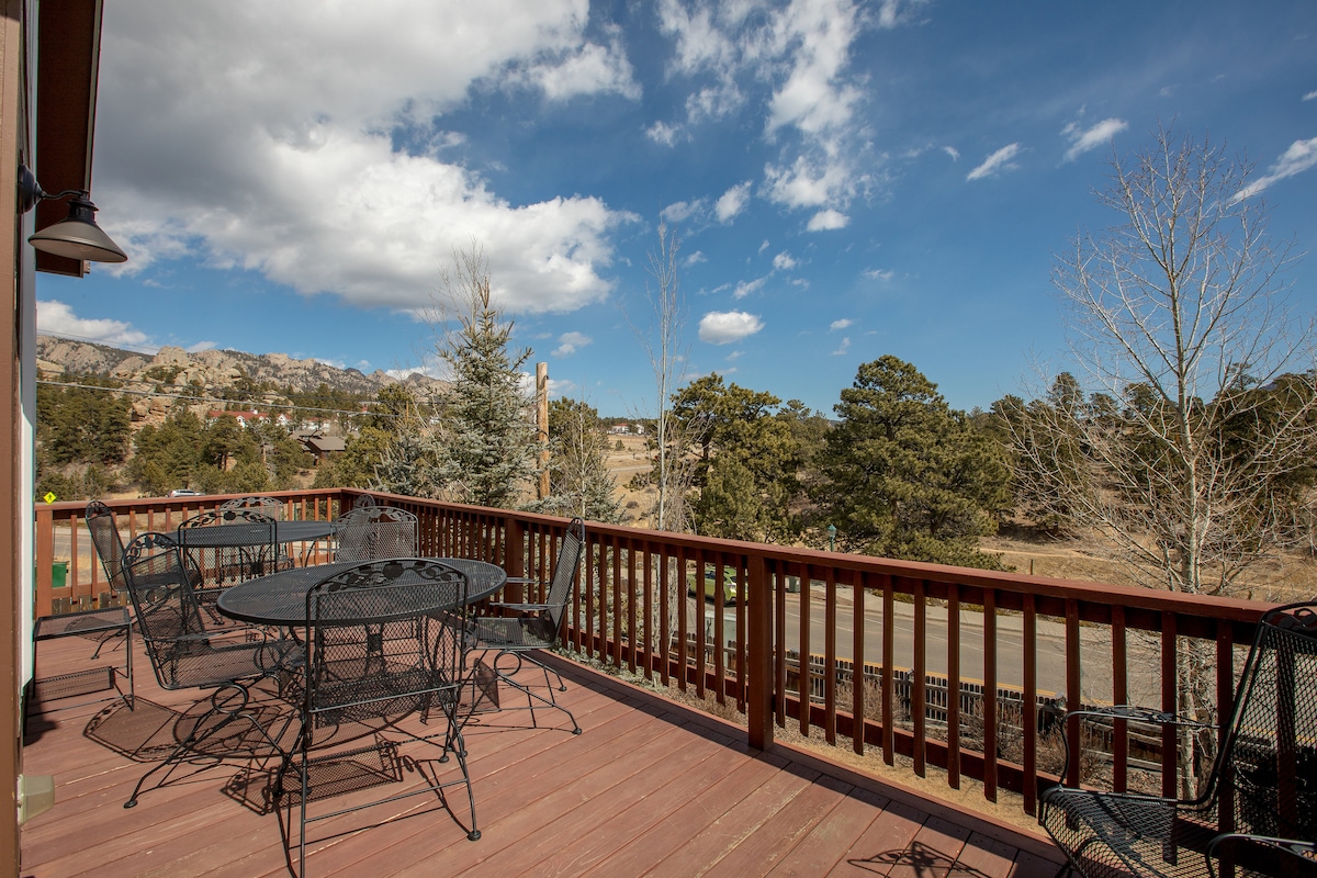 Disfruta de dos acogedoras chimeneas, vistas épicas a la montaña, 5 dormitorios y 2 camas tamaño king en tus próximas vacaciones familiares (permiso 3258). A cuadras del espacio abierto del pulgar, por lo que es probable que espíes alces, ciervos, coyotes, linces e incluso osos desde la ventana de la sala de estar. Nuestro alojamiento de 3150 s/f tiene capacidad para 12 personas y ofrece vistas a Longs Peak. Completo con una sala de juegos para los niños, cocina completa y suite principal. - A 5 minutos del centro de la ciudad - hockey de aire y videojuegos - A 10 minutos de la entrada de Nat'l Park.