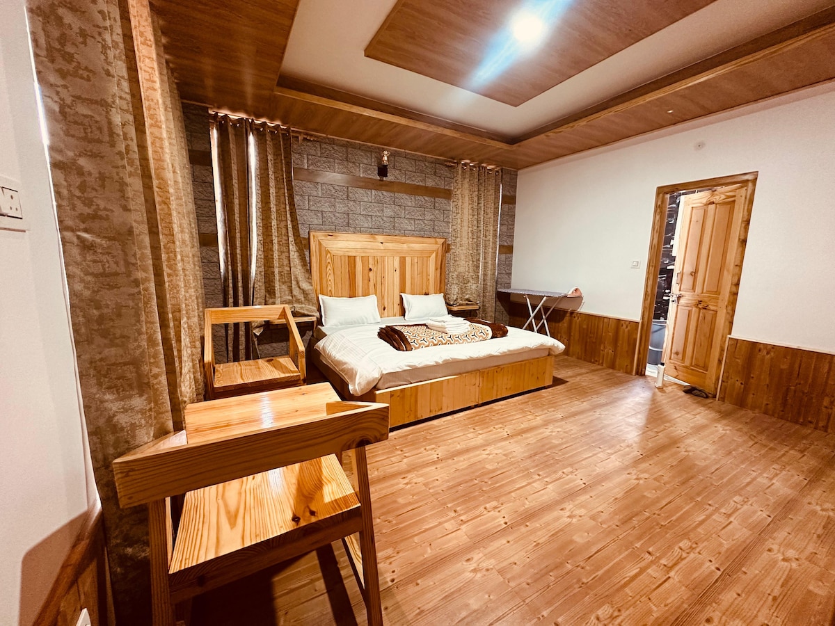 Escápate a "The Stone Hedge", donde el lujo se encuentra con la naturaleza. Nuestra exquisita planta baja de dos dormitorios de nueva construcción cuenta con amplias habitaciones con baños adjuntos para la privacidad. Disfruta de una cocina totalmente equipada y un acogedor comedor, perfecto para comidas familiares. El elegante espacio de estar invita a la relajación y el entretenimiento. Sal a un hermoso césped delantero para tomar el sol o relajarte en la zona de barbacoa, todo mientras disfrutas de las impresionantes vistas de Rohtang Pass y las montañas Pir-Panjal. ● Menú de comida.