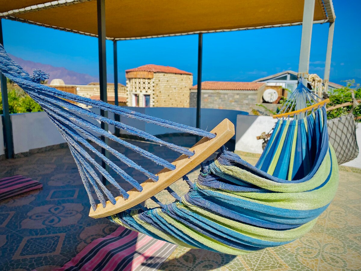 Cabana del mar is one of Assalah's hidden gems which promises you an unforgettable vacation in Dahab . Located directly on Assalah Beach ( steps from Dar Dahab ) , you Enjoy the best seaview from sunrise to sunset without having to leave the house or just relax in the beautiful balcony where u can enjoy a panoramic view of Assalah Beach and mountains while relaxing in the hammock. PLEASE NOTE: Due to Egyptian law : Egyptian couples or Arab passports holder need to provide a marriage proof .