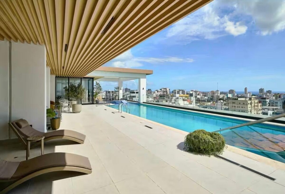 Este hermoso hospedaje esta ubicado en una de las zonas mas exclusiva , segura y centrica del país cerca de los mejores bares, restaurantes supermarket y demás; en dicho apartamento podrás disfrutarás de AC, wifi, smart TV, parqueo privado bajo techo, area común que cuenta con piscina infinita, gym/ring boxeo/cardio&pesas; también cuenta con una hermosa terraza equipada con sillas y muebles, jardín estilo zen, area de bbq y deck para tomar sol; Ven y disfruta!