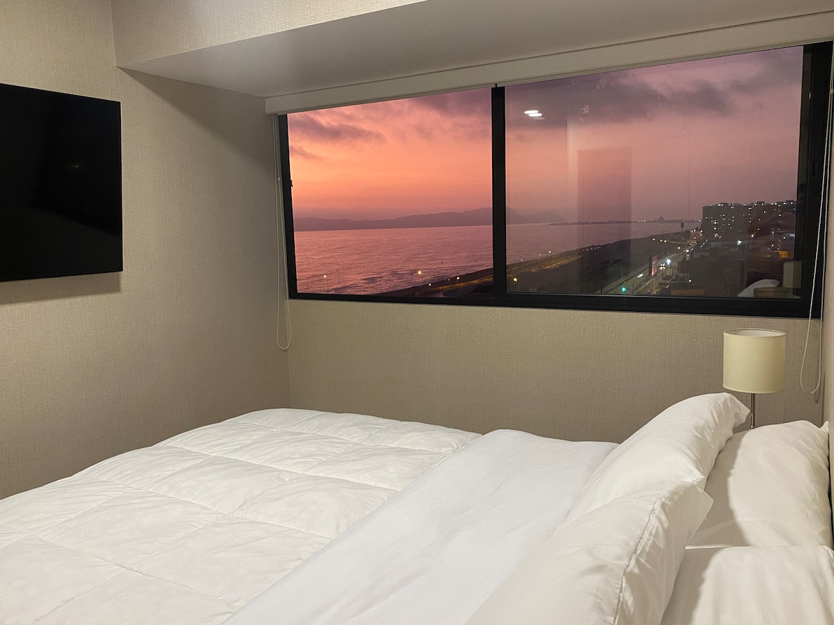 El Departamento esta ubicado cerca al aeropuerto y a 15 minutos de Miraflores por el circuito de playas ,puedes disfrutar de una vista al mar desde todos los ambientes ,contamos con servicio de transporte y tenemos soporte al huespede 24/7. . El departamento está totalmente equipado , agua caliente de alta velocidad, Wifi , 2 TVs de 55’ y cuenta con una piscina panorámica en el ultimo piso , así como sauna y gimnasio .