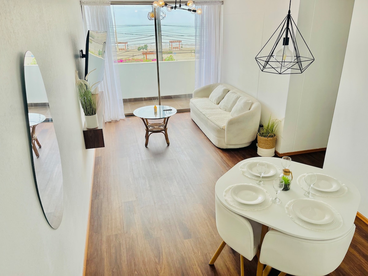 Disfruta de vistas impresionantes del mar desde el balcón de este acogedor departamento. Edificio con piscina panorámica, zona de parrillas, sala gamer y sala de niños. La sala - comedor cuenta con sofá, tv Smart, wifi. Cocina equipada con refrigeradora, horno, microondas, utensilios. Tiene tres habitaciones: con tres camas y sus respectivos closets. Dos baños con duchas (agua caliente y fría). El edificio tiene conserjes y seguridad las 24 horas del día.