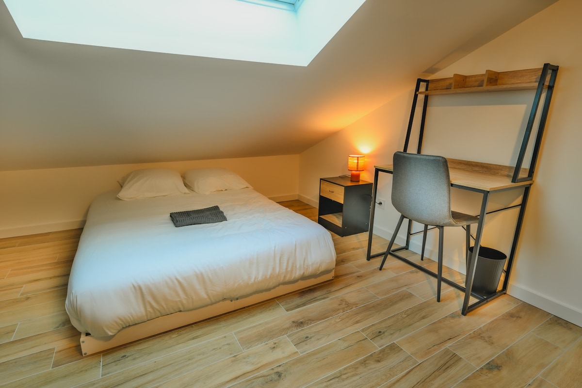 ★ 100% CONFORT ★ Disfruta de un gran estudio con encanto, luminoso, renovado y en el corazón de Gex. Techos altos, chimenea decorativa antigua, parqué: lo antiguo al gusto de hoy. Ideal para 2 personas, cuenta con una cómoda cama doble, una cocina equipada, un baño con bañera, una TV + Netflix y una pantalla Mac a disposición. A 20 minutos de Ginebra y de las estaciones de esquí, es perfecto para profesionales en misión, parejas o cualquier otro perfil.