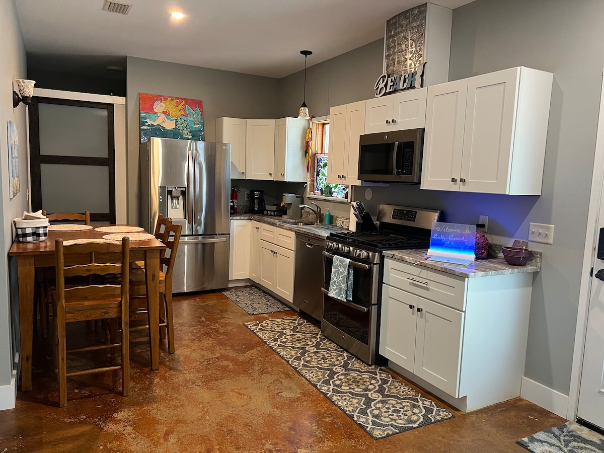 This newly renovated, charming 1926 shotgun house is located in the historic Belmont-Devilliers district in downtown Pensacola. The home is a short walk or bike ride to Blue Wahoos stadium, Joe Patti's Seafood, and Palafox Street. The home has every convenience; new HVAC, appliances & fully equipped kitchen with Keurig/coffee, smart TVs, and Wi-Fi. Additionally, the full bath has a standard whirlpool tub/shower and the backyard has a playhouse for the kiddos. Come enjoy your home away from home.