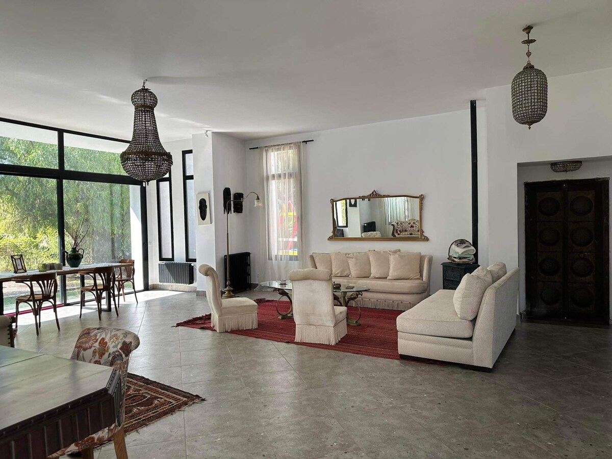 Ponemos en alquiler una hermosa villa situada en una gran granja cerca de Morneg ( justo detrás del centro comercial Azur City a 15 minutos de Túnez). Consta de una gran sala de estar con un gran ventanal,una cocina totalmente equipada abierta a la sala de estar,dos dormitorios dobles,una suite muy grande atípica que incluye un altillo con una cama doble. La casa tiene dos baños y un baño. La casa está climatizada y climatizada .