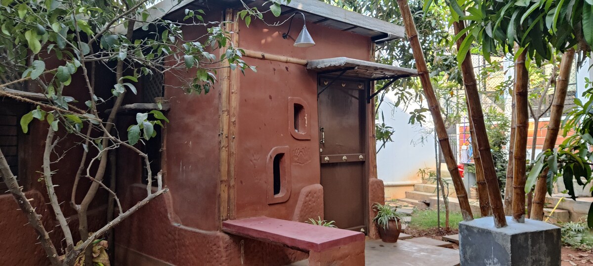 Relájate en esta casa de campo de tierra ecológica situada en un vibrante jardín urbano. Destacada en importantes revistas de arquitectura, está construida con una técnica tradicional de «paja y adobe» utilizando tierra, arcilla y paja, con bambú para los elementos estructurales, manteniéndola fresca y cómoda incluso en verano. Una experiencia verdaderamente única sin igual en la ciudad jardín de Bangalore, esta propiedad es el epítome de la sostenibilidad y difumina el límite entre la vida hogareña y la naturaleza. A menos de 30 minutos del aeropuerto.