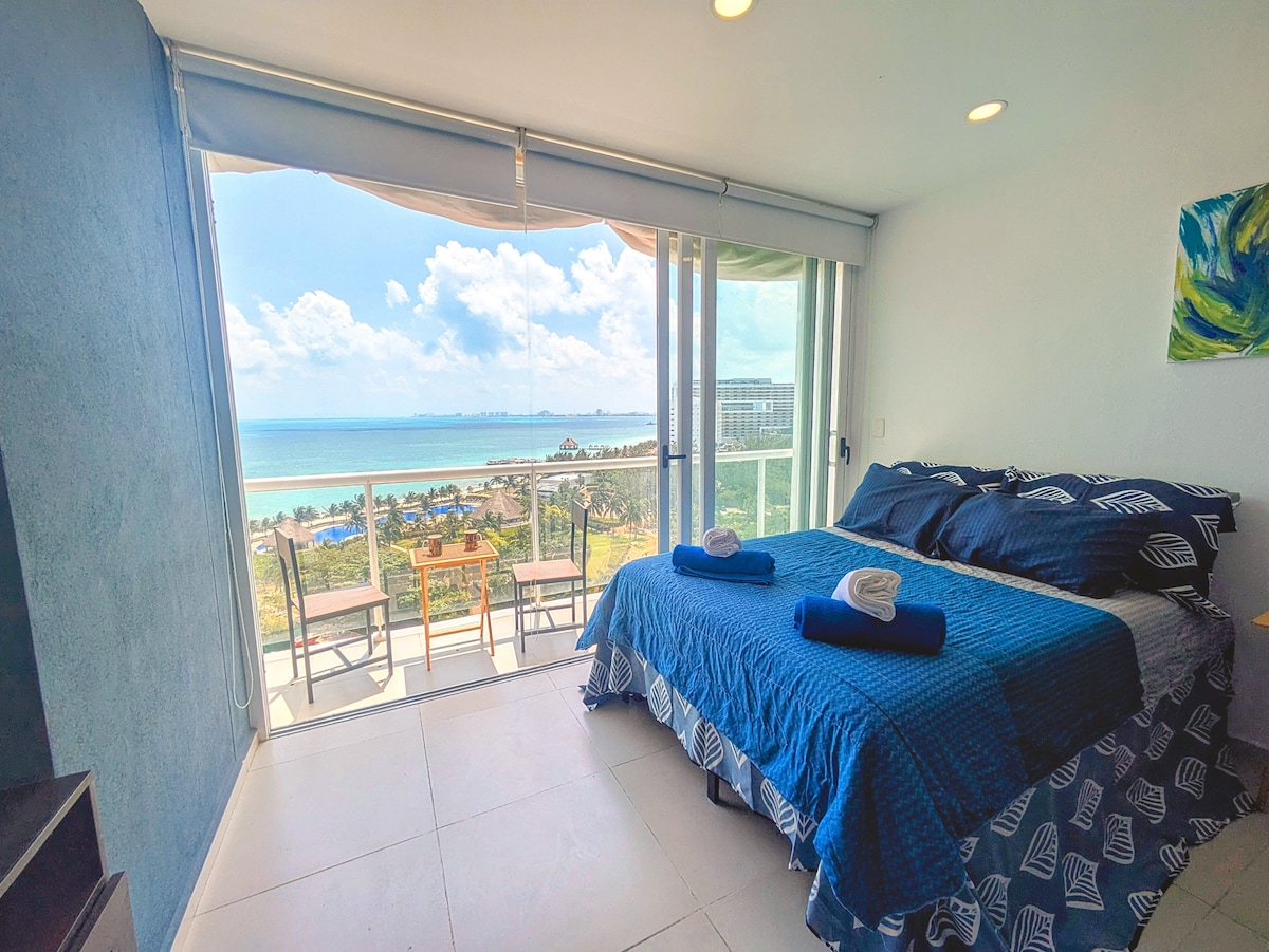 *Para mantener la tranquilidad y seguridad del condominio, solo aceptamos en este departamento familias o amigos que viajan por descanso o negocios . No se permiten grupos que vienen de fiesta , visitas ni invitados extras. Se solicitará una ID de cada huésped antes de su llegada para su registro* Estudio con vista al mar. Totalmente amueblado y equipado con decoración estilo nórdico. Una de las mejores ubicaciones, entre el centro de Cancún y la zona hotelera*