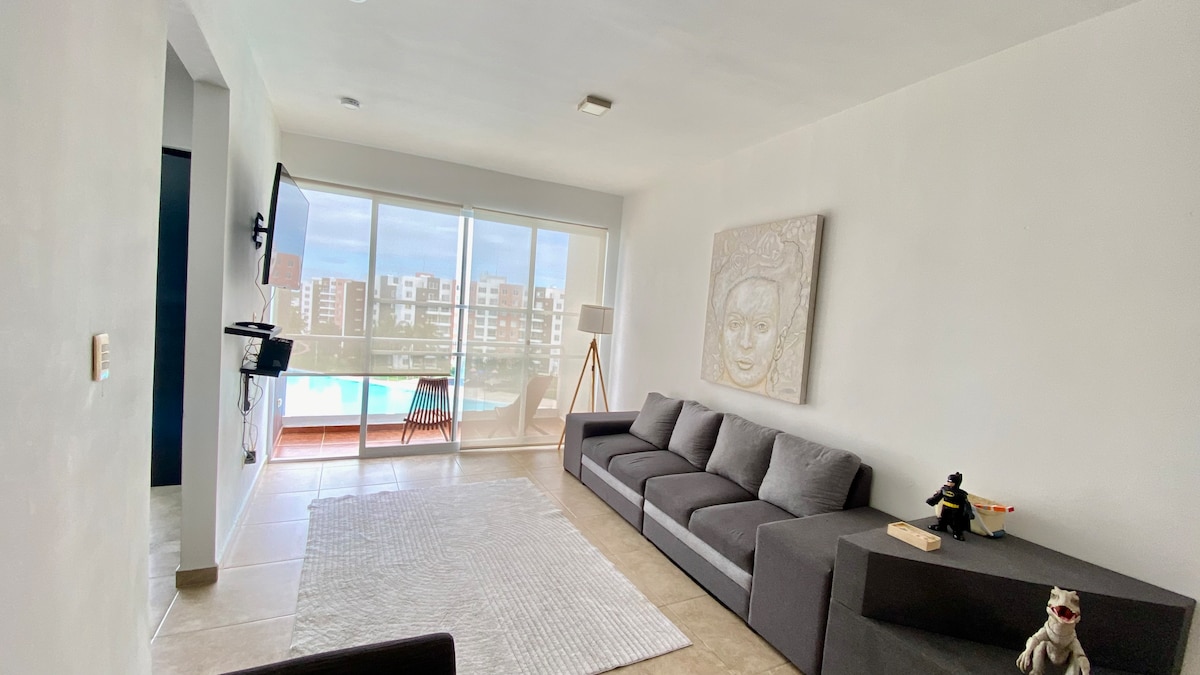 Apartamento hermoso, limpio y exclusivo para cada grupo de hospedaje. Balcón, terraza, 3 recámaras. 2 baños. Con vista espectacular a la laguna (artificial), 7 albercas, jardines. Seguridad 24/7. Estacionamiento, Wi Fi, Aire Acondicionado, Ventiladores, 2 Smart T.V. , Netflix, Lavadora, secadora, plancha, secador de pelo, Caja de seguridad, etc. Supermercado, Tiendas de conveniencia, Cafeterías, gasolinera, restaurantes y bares, servicio de Emergencias, ATM, a 3 cuadras del Complejo.