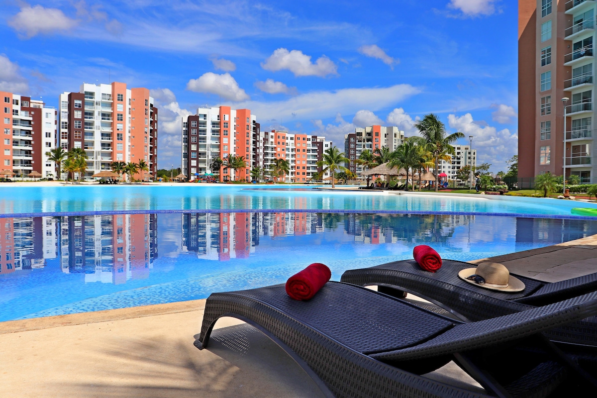 Vive unas increibles vacaciones en un lindo departmento en "Dream Lagoon Cancún" Con una fastuosa laguna artificial de 1km de diametro, donde podrán disfrutar del sol caribeño mientras se deleitan con los hermosos atardeceres. Podrás practicar kayak, veleo o simplemente relajarte en un camastro. Integradas a la laguna hay siete albercas, y alrededor una pista para correr por las mañanas. ➼ Al sur de Cancún en una zona tranquila con seguridad 24/7. ➼ Aeropuerto a 25 min ➼ Playas a 25 min