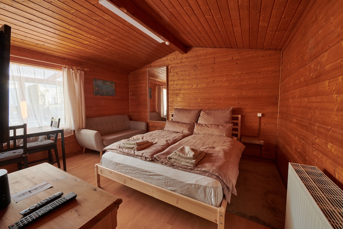 pequeña casa de campo tranquila y acogedora con gran terraza Baño con ducha,cama de matrimonio en el área para dormir Cocina equipada con comedor, nevera-congelador,lavavajillas,TV, Chimenea eléctrica para horas acogedoras